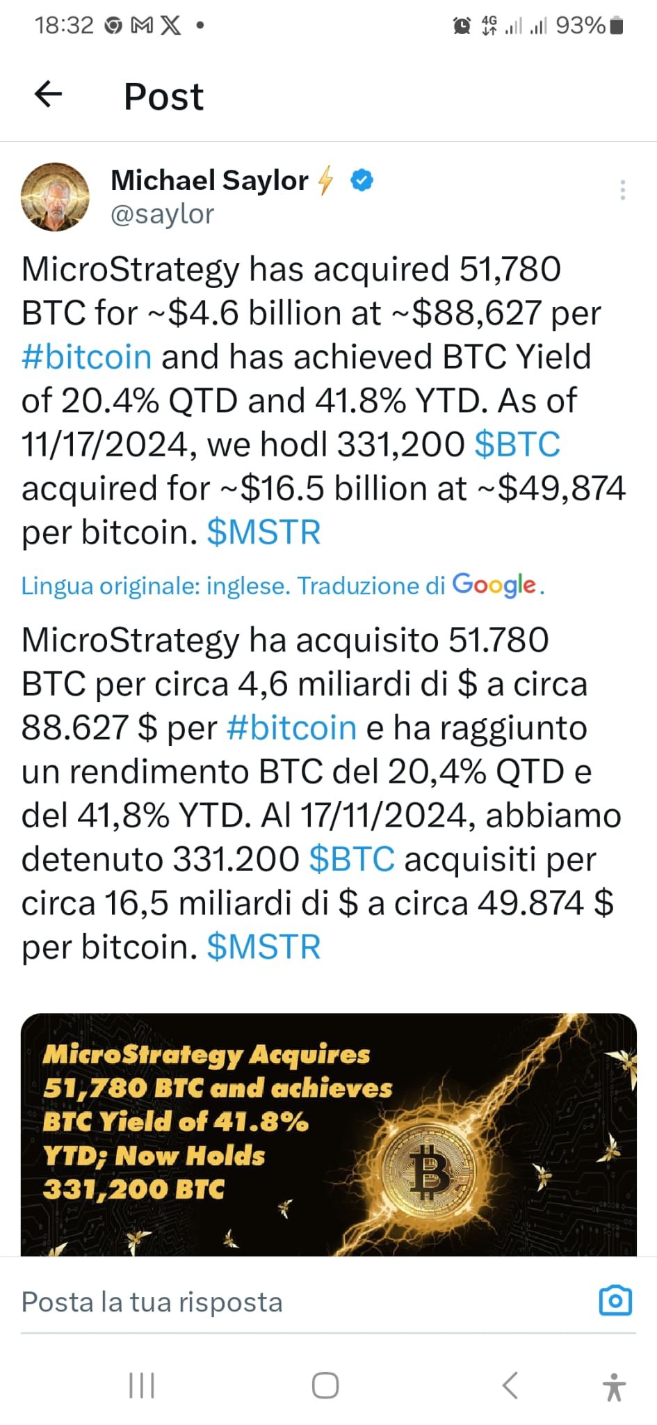 | 18/11/2024 | Holdings Microstrategy | MicroStrategy ha acquisito 51.780 BTC per ~$4,6 miliardi a ~$88.627 per #bitcoin e ha ottenuto un rendimento in BTC del 20,4% QTD e del 41,8% YTD. Al 17/11/2024, abbiamo acquisito 331.200 $BTC per ~16,5 miliardi di dollari a ~49.874 dollari per bitcoin. $MSTR |